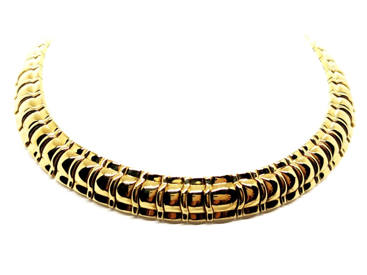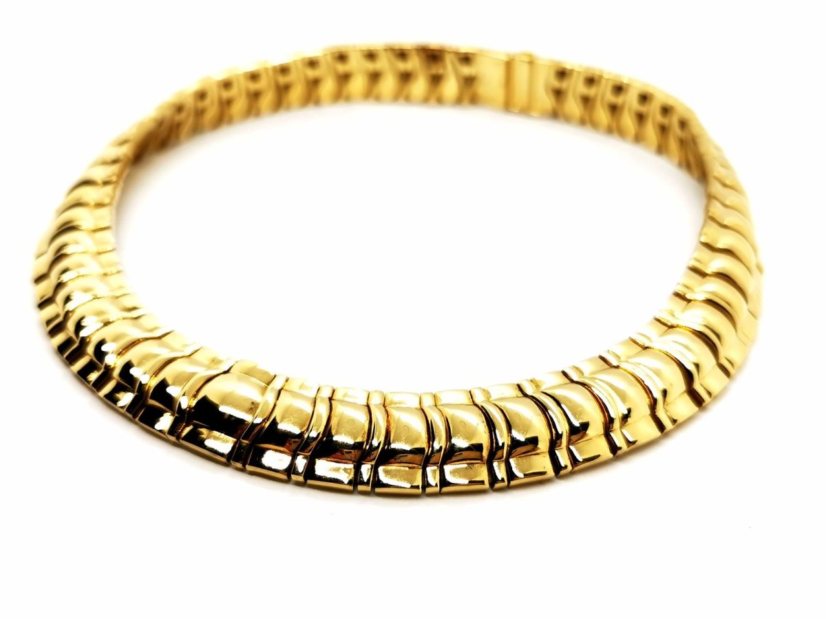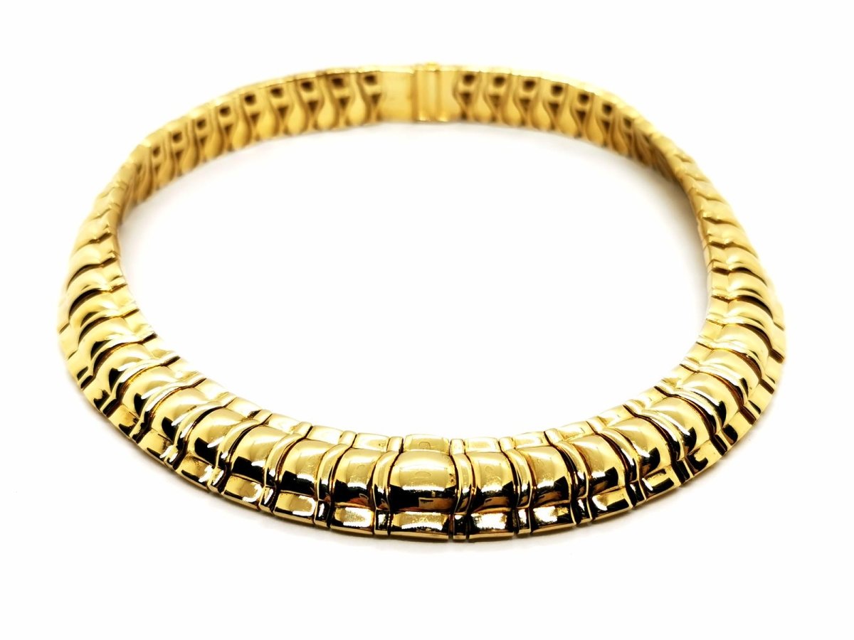 Collier signé de la maison Piaget. collection Tanagra. en or jaune 750 millièmes (18 carats). modèle ras de cou. longueur: 38 cm. largeur: 0.7 cm. épaisseur: 0.2 cm. poids total: 150.46 g. année 1990. signé et numéroté. poinçon tête d'aigle. excellent état