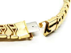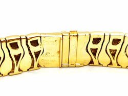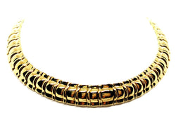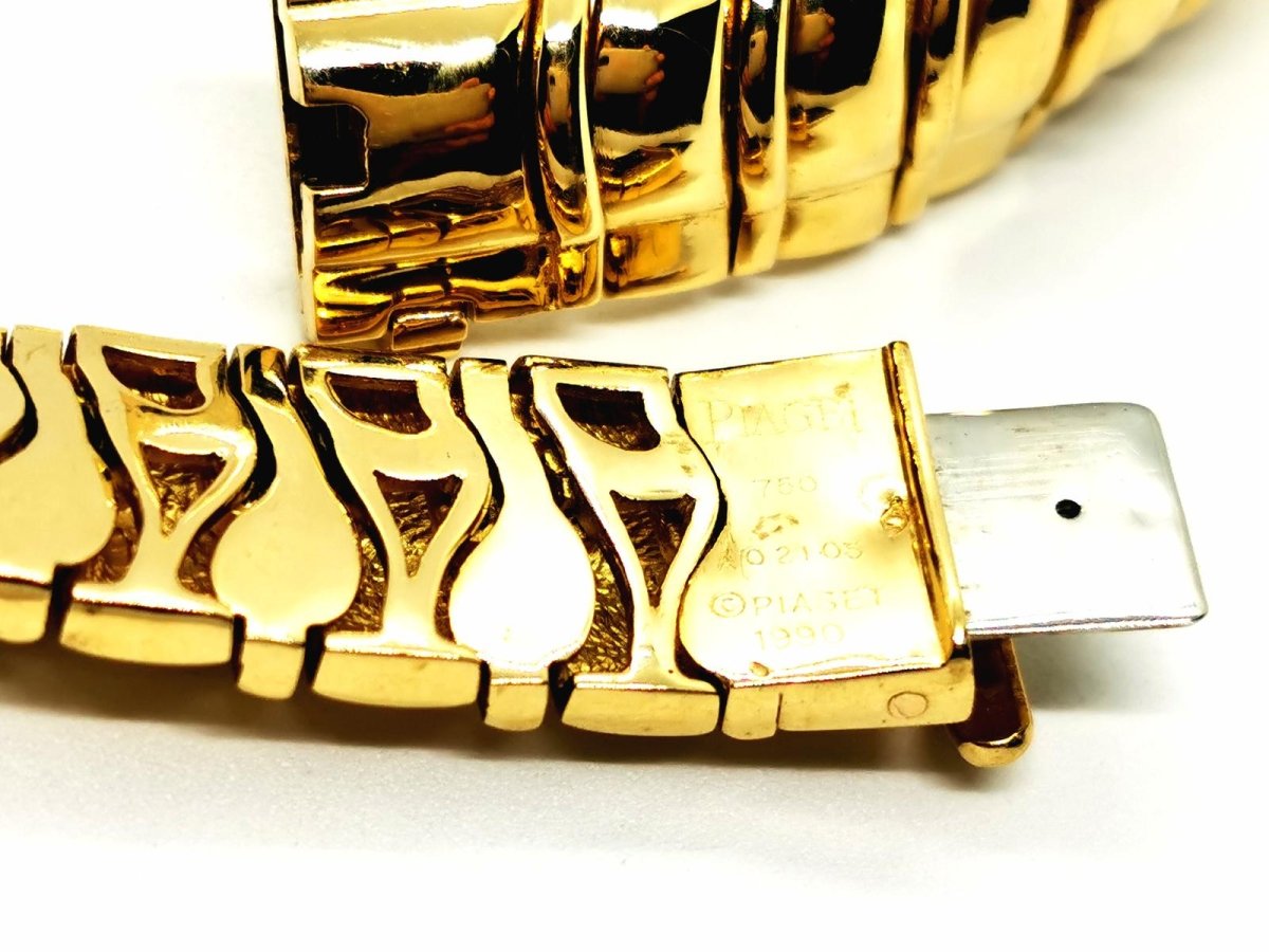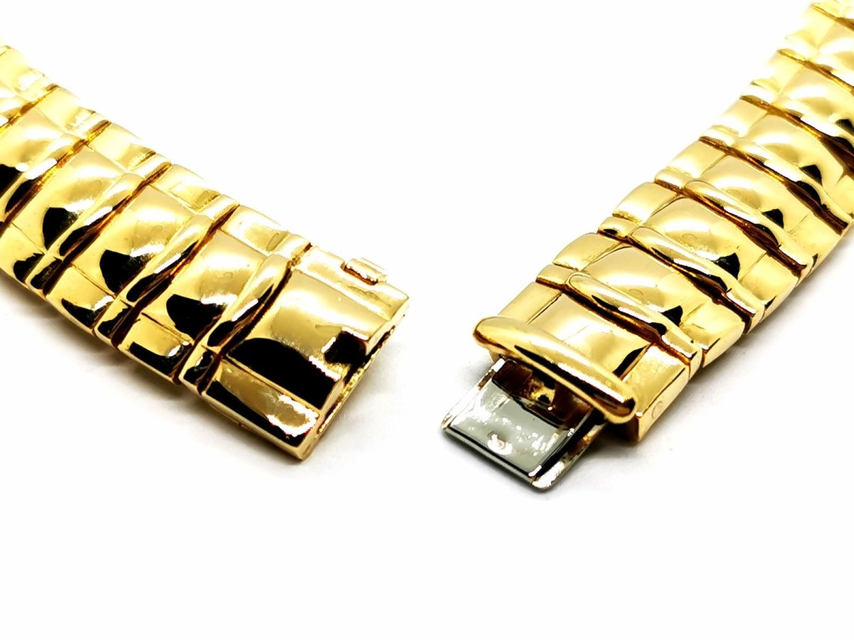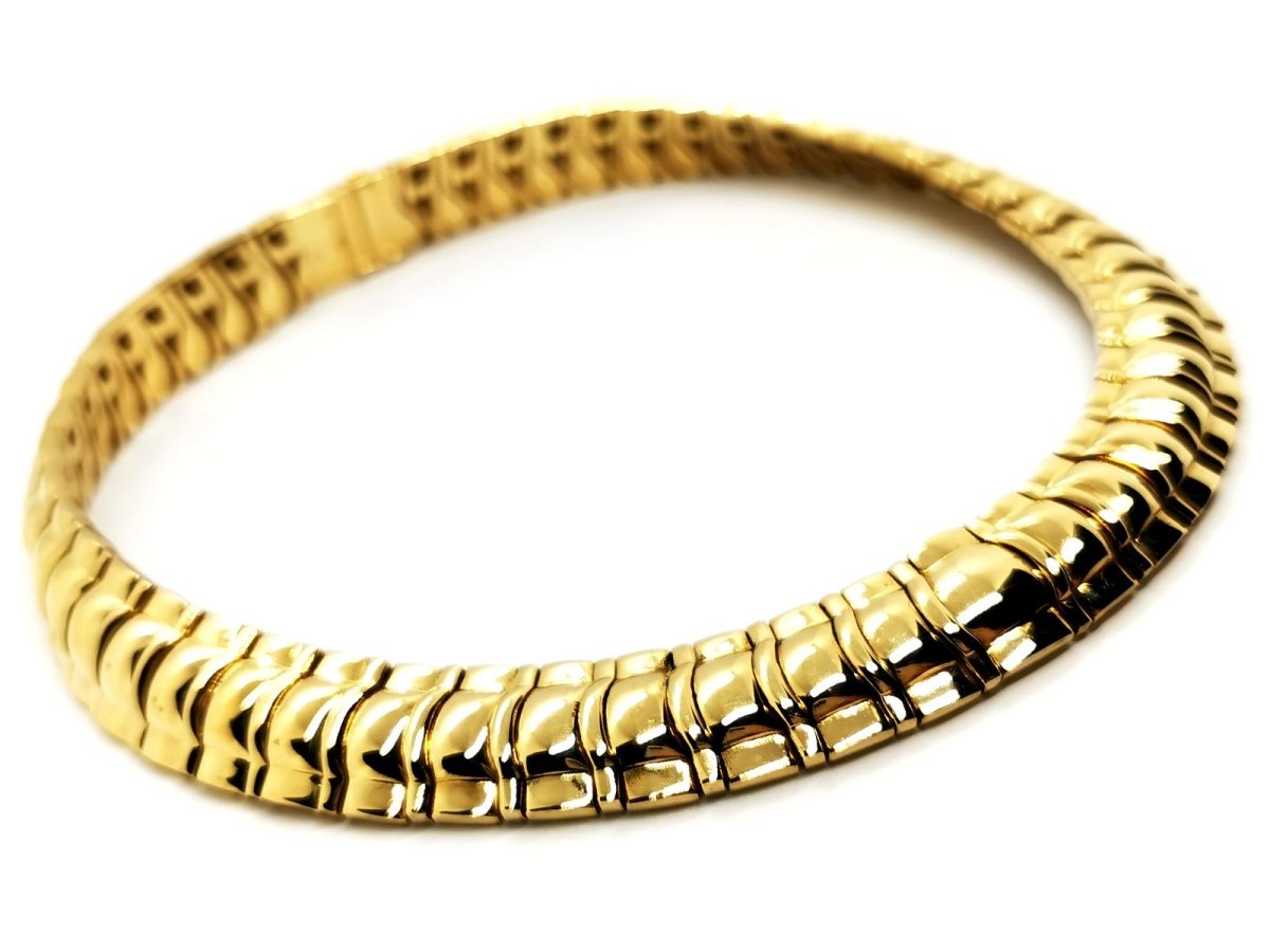 Collier signé de la maison Piaget. collection Tanagra. en or jaune 750 millièmes (18 carats). modèle ras de cou. longueur: 38 cm. largeur: 0.7 cm. épaisseur: 0.2 cm. poids total: 150.46 g. année 1990. signé et numéroté. poinçon tête d'aigle. excellent état