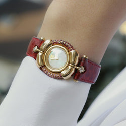 RENE BOIVIN - Montre bracelet “Chrysalide”en or jaune 18k (750°/°°). Le boîtier rond serti de saphirs et de rubis sur lequel coulissent 4 éléments mobiles permettant de porter la montre tout saphir, tout rubis ou moitié moitié. Le cadran à fond nacré monogrammé RB pour René Boivin. Le bracelet en cuir rouge est rehaussé de deux diamants taille asscher. Le fermoir à double boucle déployante. Mouvement quartz. Travail des années 2000. Signé et numéroté au dos. Diamètre de la boîte : 2,7 cm lorsque les éléments mobiles sont ouverts et 3,1 fermésDiamètre du cadran : 1,3 cmLargeur du bracelet : 1,5 cmPoids brut : 67,85 grammes