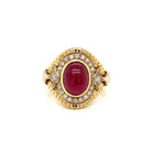 Magnifique bague cocktail rétro montée en or jaune 18k sertie d'un rubis naturel pesant 5 cts entouré d'environ .50 carats de diamants ronds de taille brillant classés G couleur Vvs.CONDITION : Preowned - Excellent METAL:18k goldDESIGN ERA : Retro circa 1950 RING SIZE : US 7.5 - IT 16 - FR 56 - UK P, Redimensionnable sur demande POIDS : 10 grammes* chaque bijou que nous proposons à la vente est testé professionnellement par notre équipe interne de spécialistes en gemmologie I.G.I./HRD - ** le bijou est livré avec une expertise gemmologique dans une belle boîte à bagues