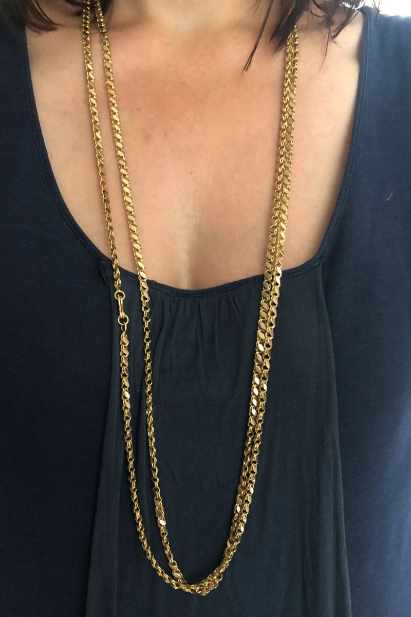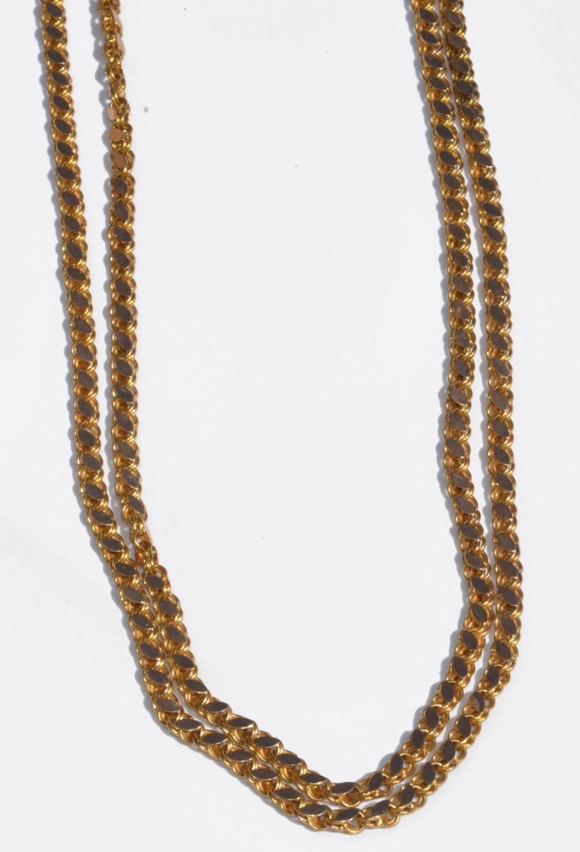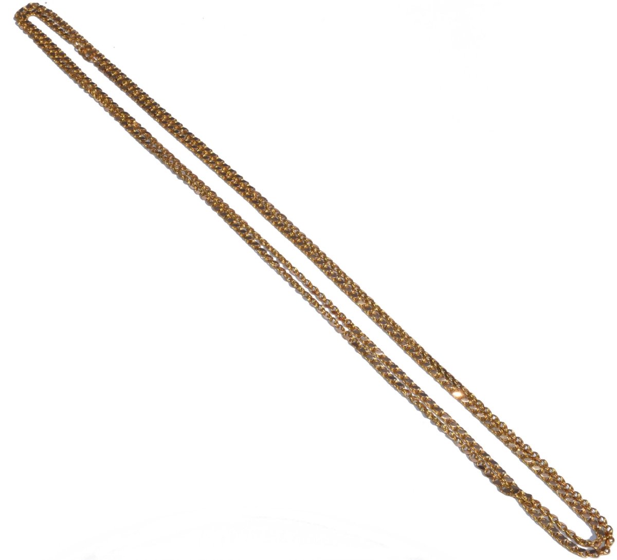 Sautoir ancien en or rose formant une maille gourmette  Matière : Or rose 18k Poinçon : Hibou Poids : 65 grs Longueur : 98,5 cm Période: 1900-1910