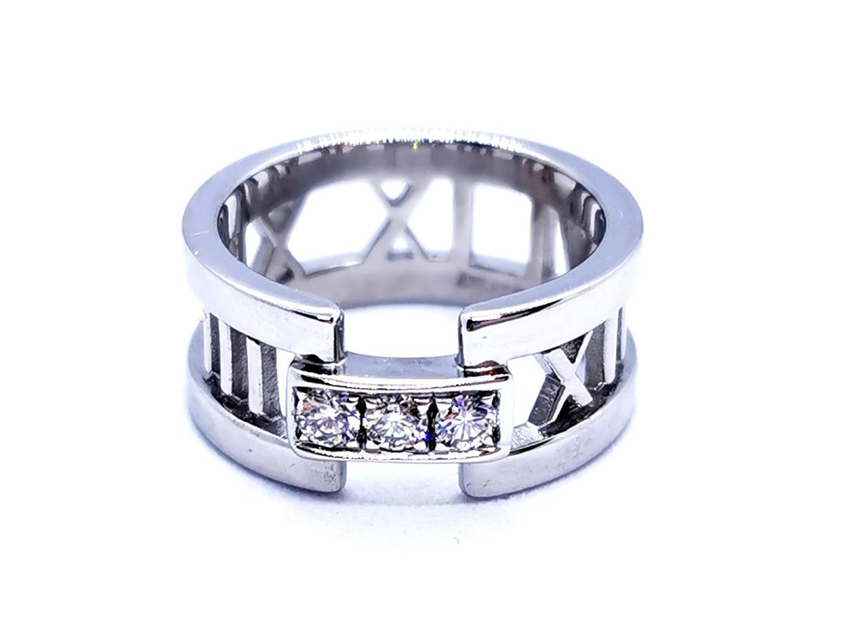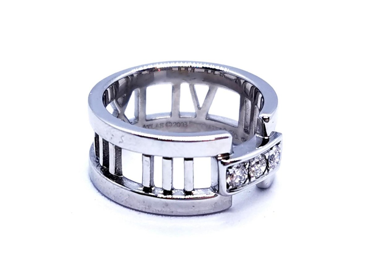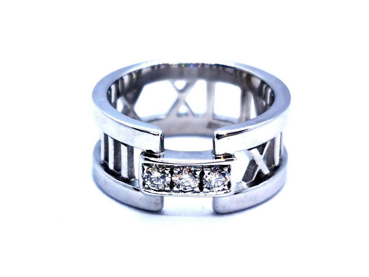 Bague signée de la maison Tiffany & Co. collection ajourée Atlas. en or blanc 750 millièmes (18 carats). sertie de 3 diamants. taille brillant. pour un total d'environ 0.18 ct. taille: 50. largeur: 0.85 cm. poids total: 7.09 g. poinçonnée et signée. excellent état. prix neuf: 2550€