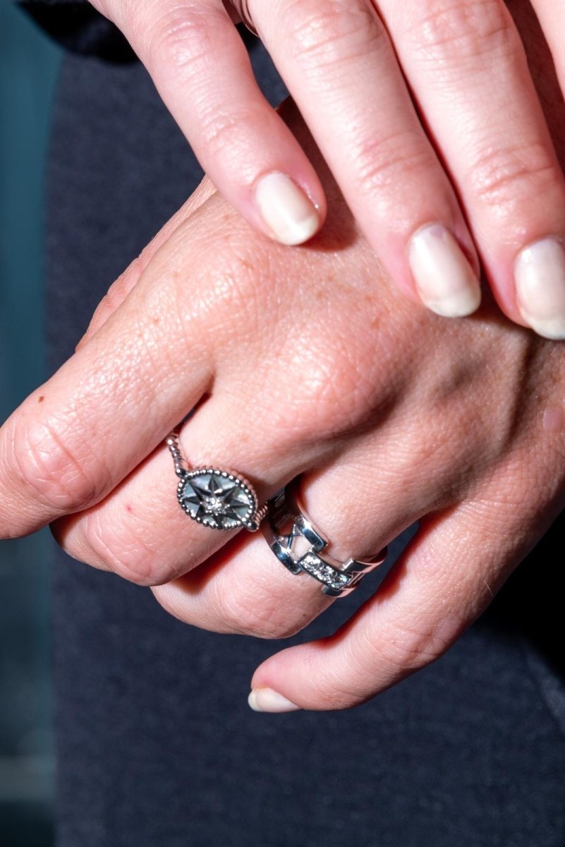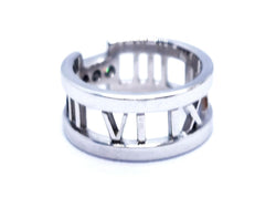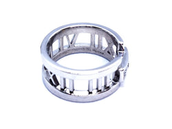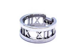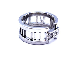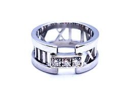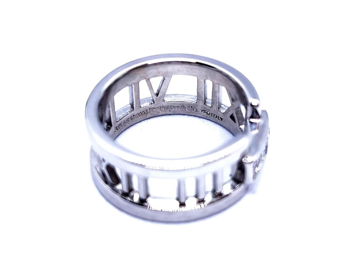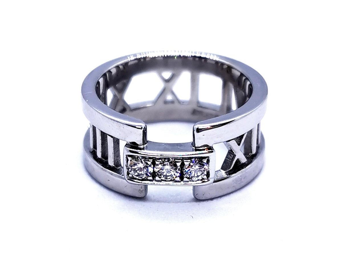 Bague signée de la maison Tiffany & Co. collection ajourée Atlas. en or blanc 750 millièmes (18 carats). sertie de 3 diamants. taille brillant. pour un total d'environ 0.18 ct. taille: 50. largeur: 0.85 cm. poids total: 7.09 g. poinçonnée et signée. excellent état. prix neuf: 2550€