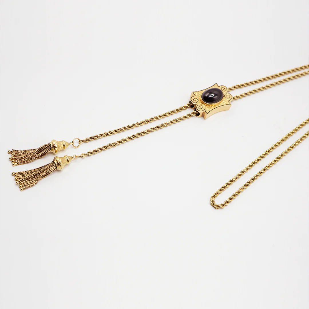 14K yellow gold. The slide is set with black enamel and an oval garnet cabochon England, circa 1880 stamped 585 110 cm 46,6 gr